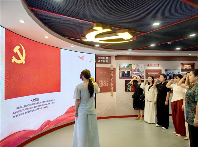 活动最后,参会党员整齐列队,面向鲜红的党旗,高高举起右手,庄重地重温入党誓词。“我志愿加入中国共产党……”誓言掷地有声、铿锵有力,在展馆内久久回荡,淋漓尽致地彰显出党员们对党的无限忠诚与坚定信念。