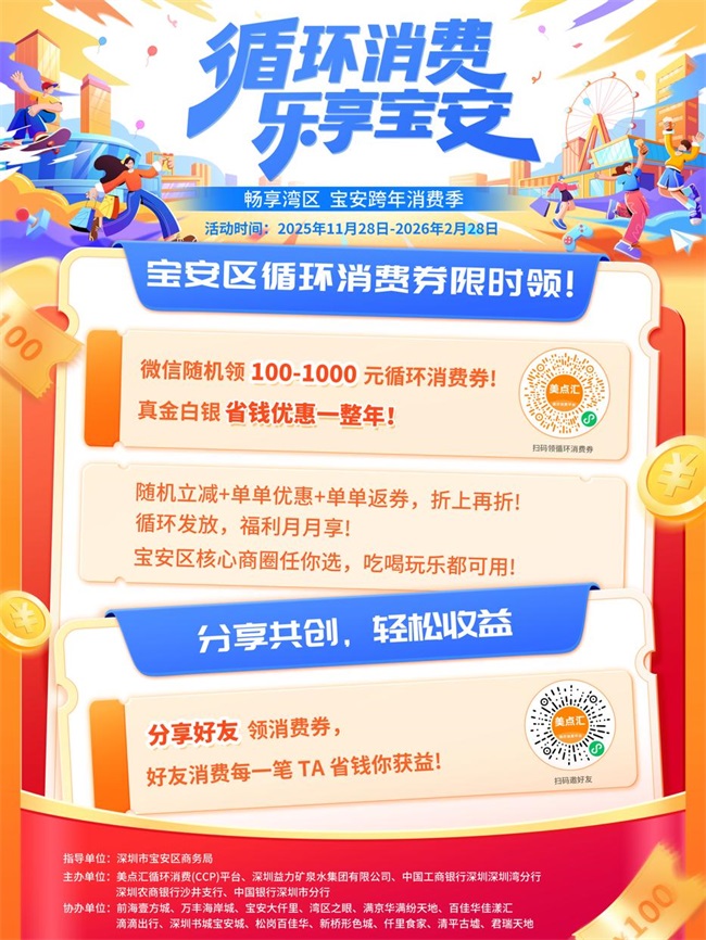 11月28日上午,循环消费·乐享宝安”宝安跨年消费季循环消费活动启动仪式在前海壹方城音乐广场举行。本次活动由宝安区商务局指导,携手美点汇循环消费平台,通过“政府搭台、商业唱戏、民生受益”的模式,推出亿元级专享循环消费券,助力市民享实惠、商户增活力、区域促发展。