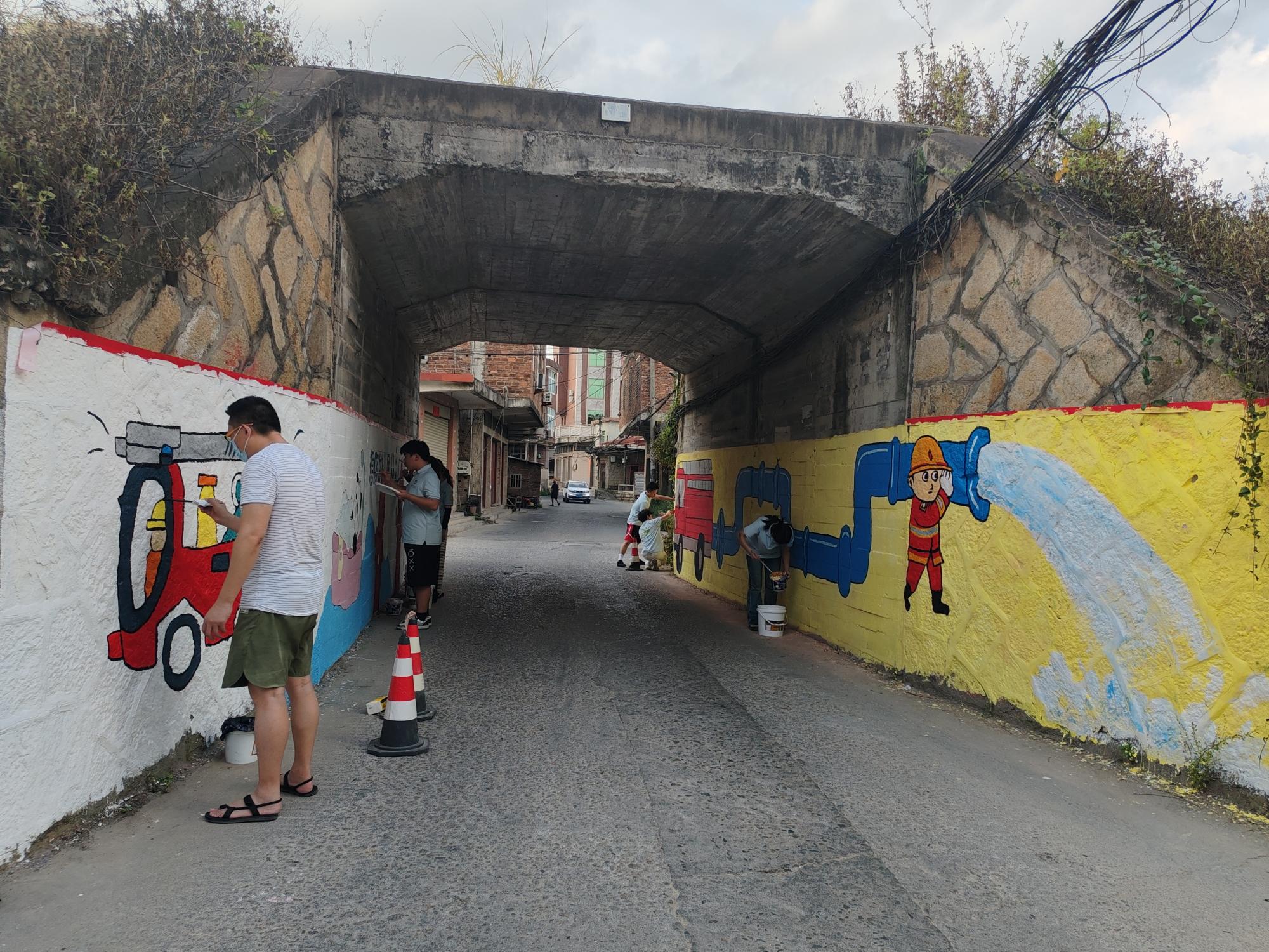 “青春执笔,绘美溪洲”志愿服务队正在制作墙绘