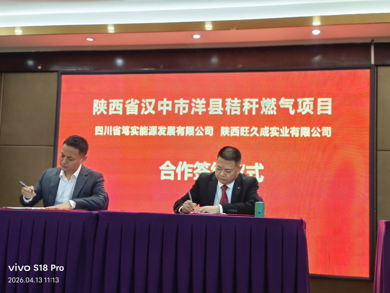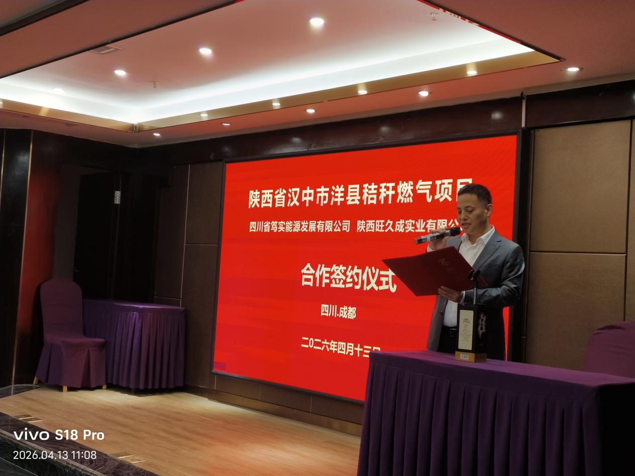 4月13日,陕西省洋县秸秆燃气项目合作签约仪式在蓉隆重举行。四川省笃实能源发展有限公司与陕西旺久成实业有限公司正式签署合作协议,标志着这一绿色清洁能源重点项目进入实质性推进阶段。社会各界人士及有关部门负责人出席仪式,共同见证签约,对项目落地给予高度重视和大力支持。